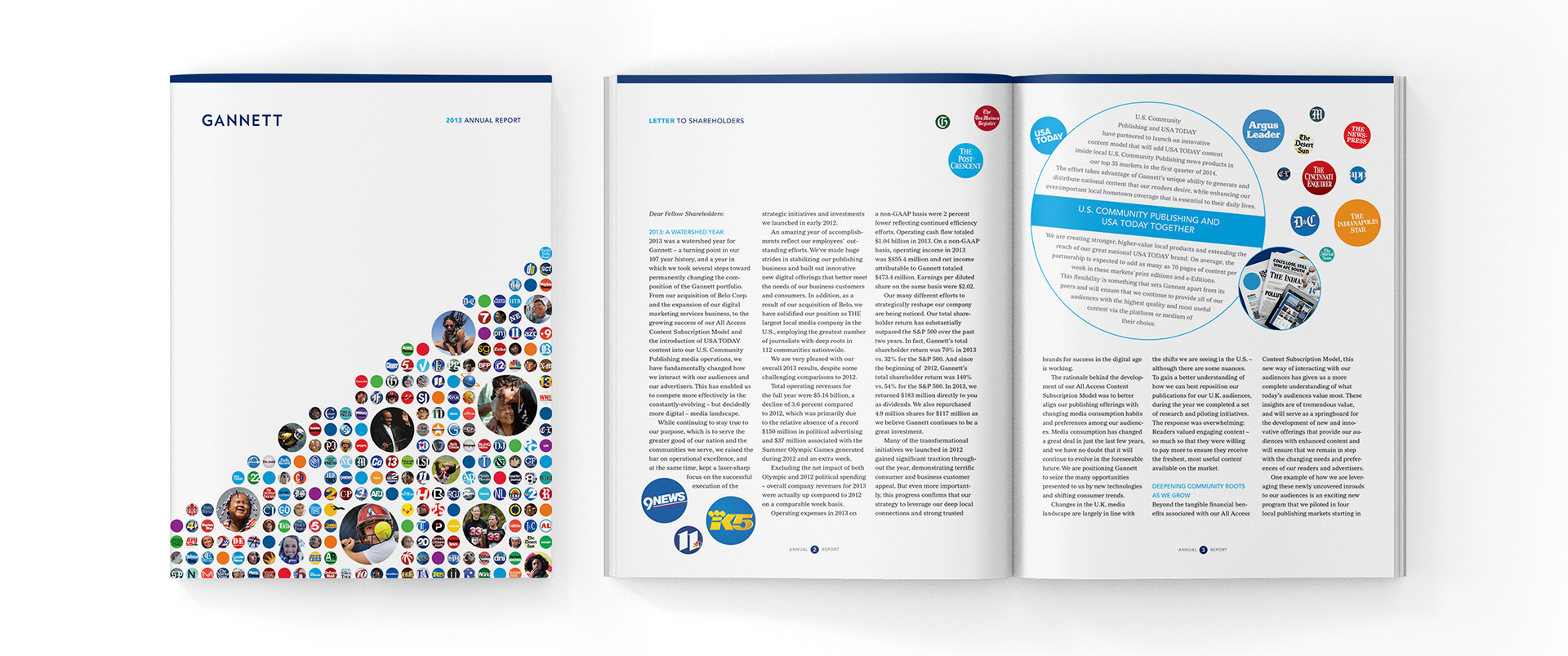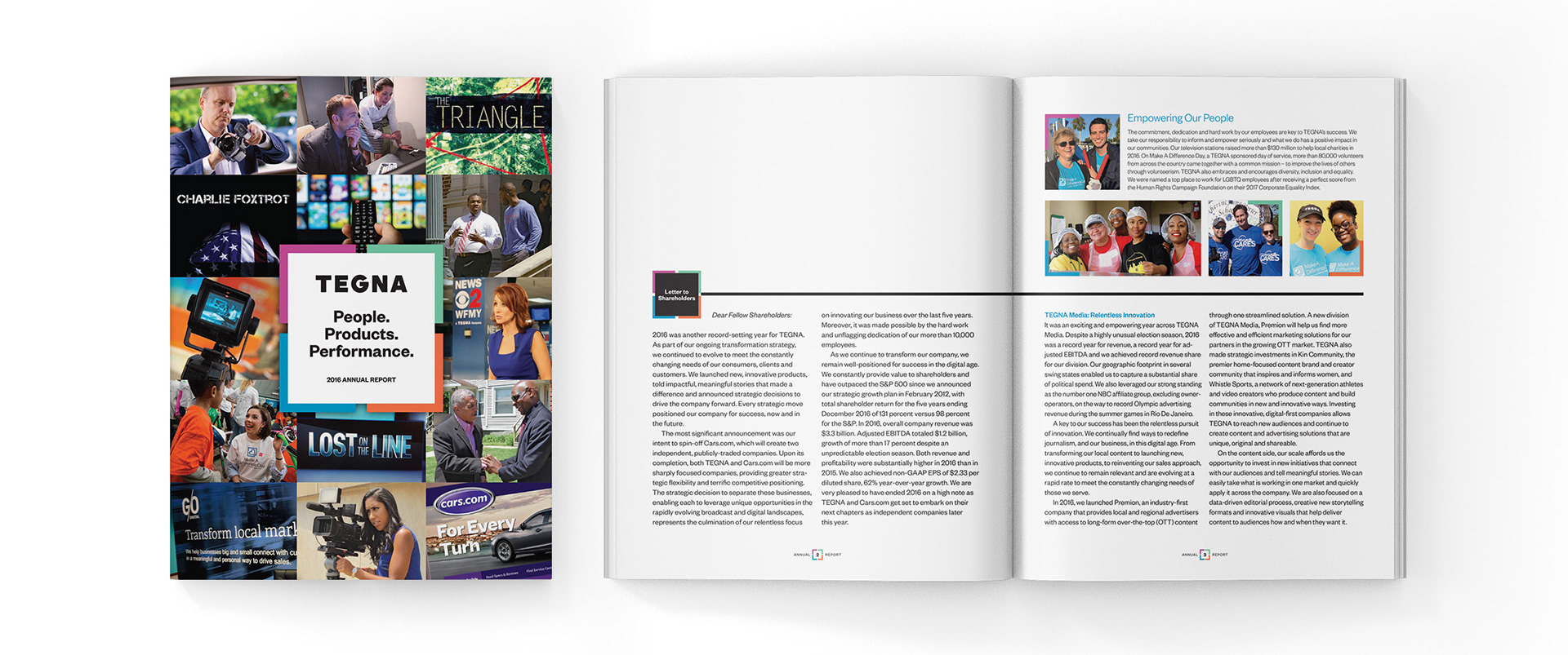 In my time with Gannett/TEGNA I have had the pleasure to design and produce 24 annual reports from concept to completion including editing and formatting the 10k (financial report).